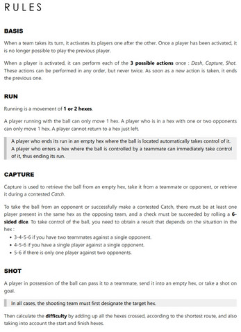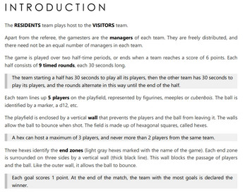 A partygame for 2 to 7 gamesters aged 8 and over. It can be played with family or friends. Two teams compete over a soccer match in an arena of hexagons. Rounds are timed, so you got to hurry your strategy to win !