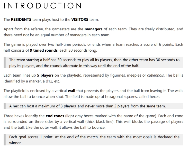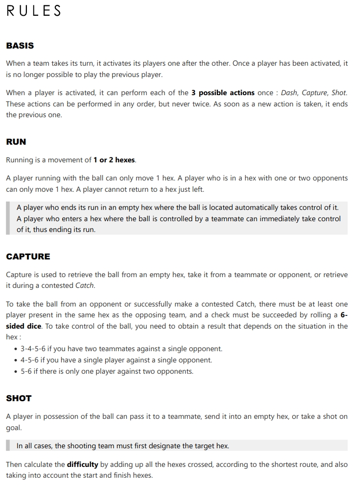 Un partygame pour 2 à 7 participants, à partir de 8 ans. Il peut se jouer en famille ou entre amis. Deux équipes s'affrontent lors d'un match de football dans une arène composée d'hexagones. Les tours sont chronométrés, il faut réfléchir et se décider vite pour gagner !